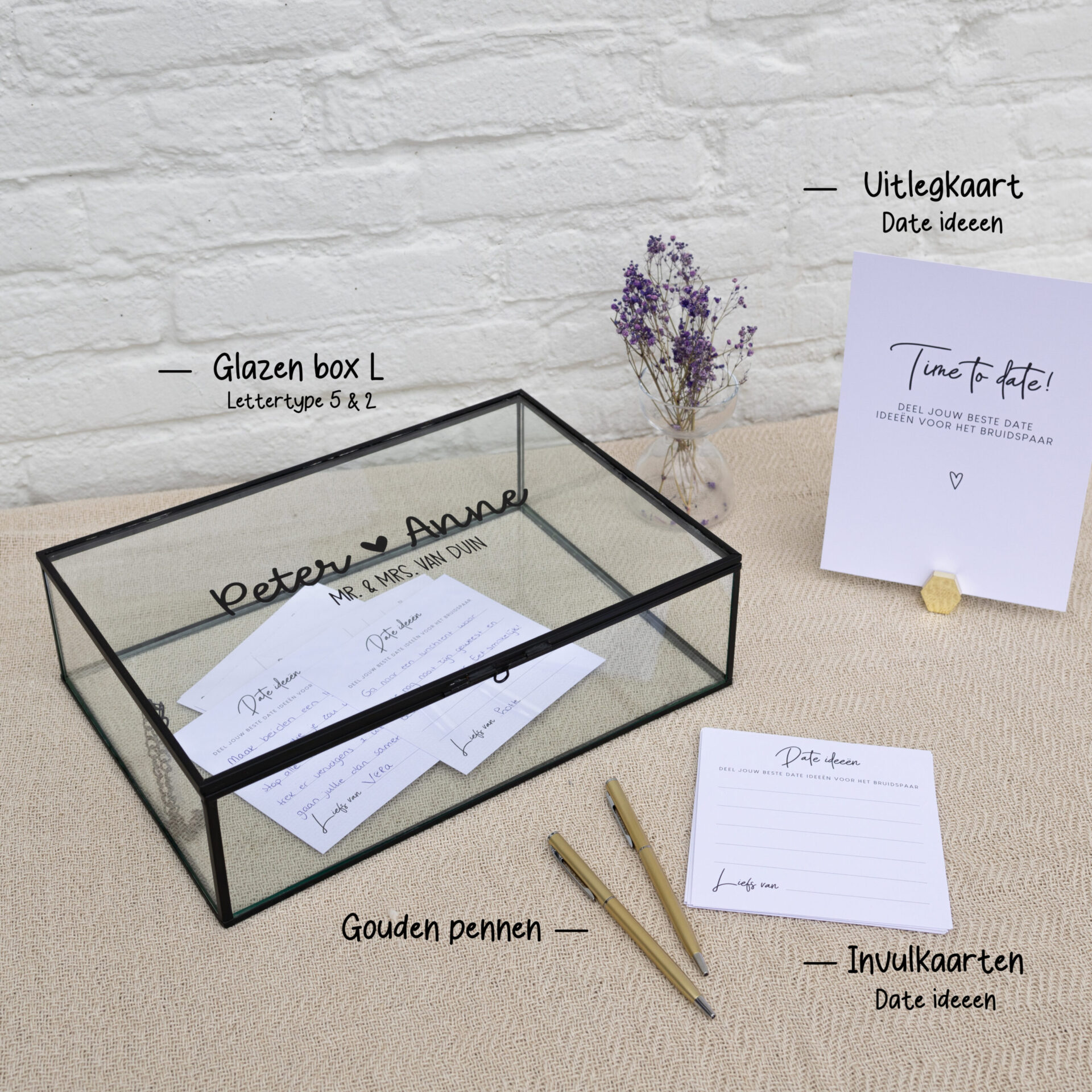 Wil je het helemaal compleet maken? Kies dan voor het gastenboekset, inclusief een gepersonaliseerde glazen box, invulkaarten, pennen en een kaart met uitleg.