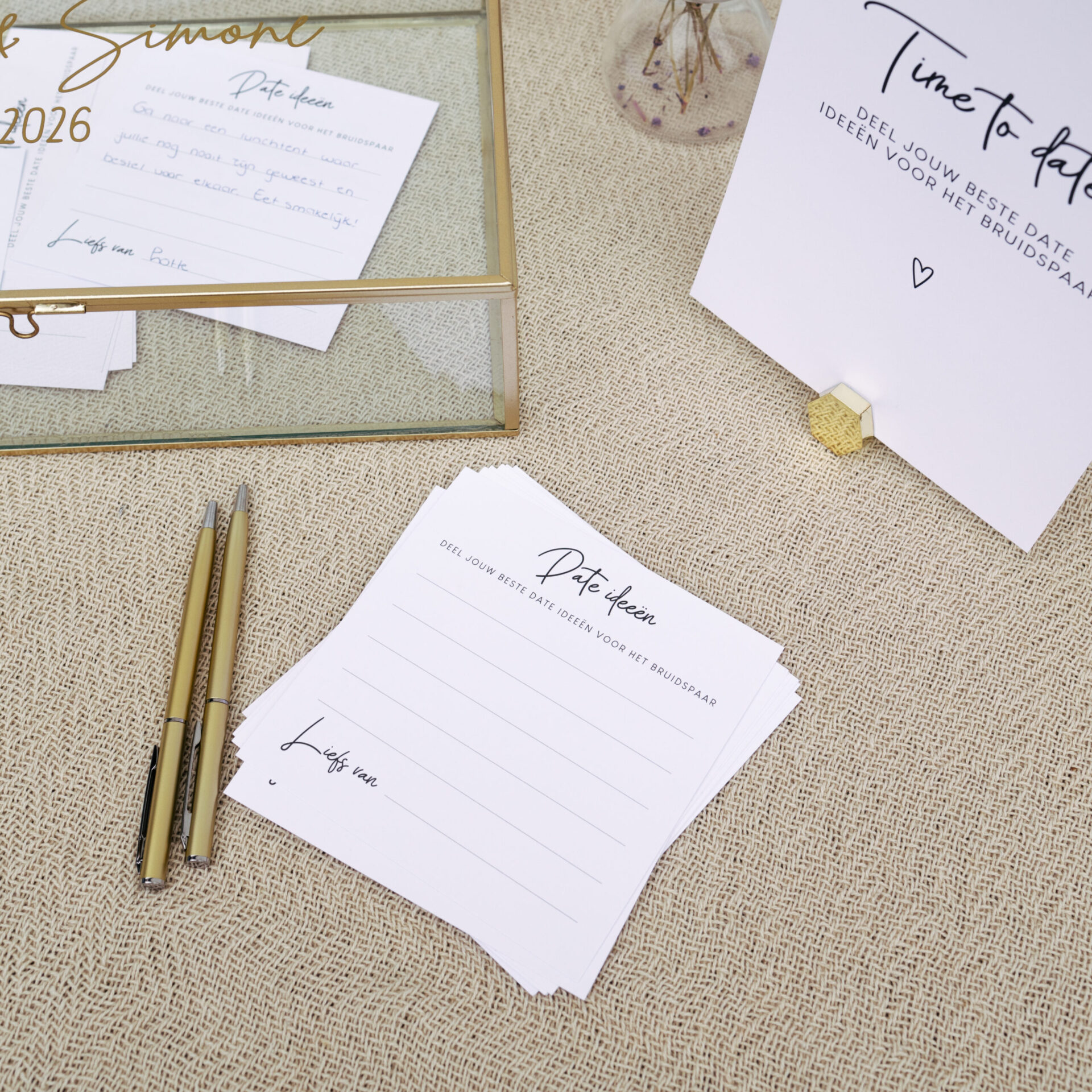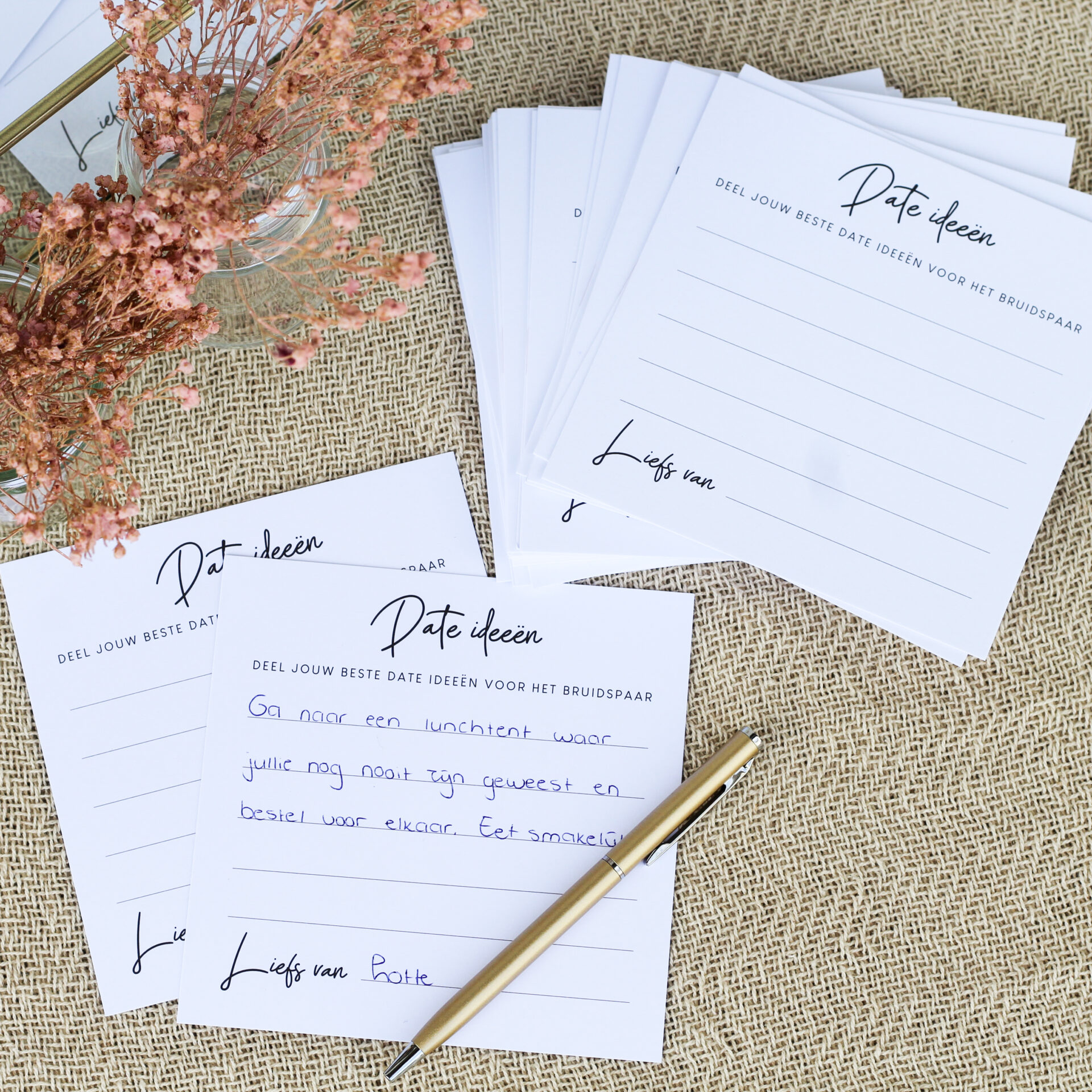 Deze invulkaarten zijn dé perfecte keuze voor een gastenboek bruiloft alternatief. Laat jullie gasten hun favoriete date-ideeën delen op de invulkaarten. Zo verzamelt het bruidspaar originele tips om samen te genieten in de maanden en jaren na de grote dag. Een creatieve en persoonlijke toevoeging aan elke bruiloft!