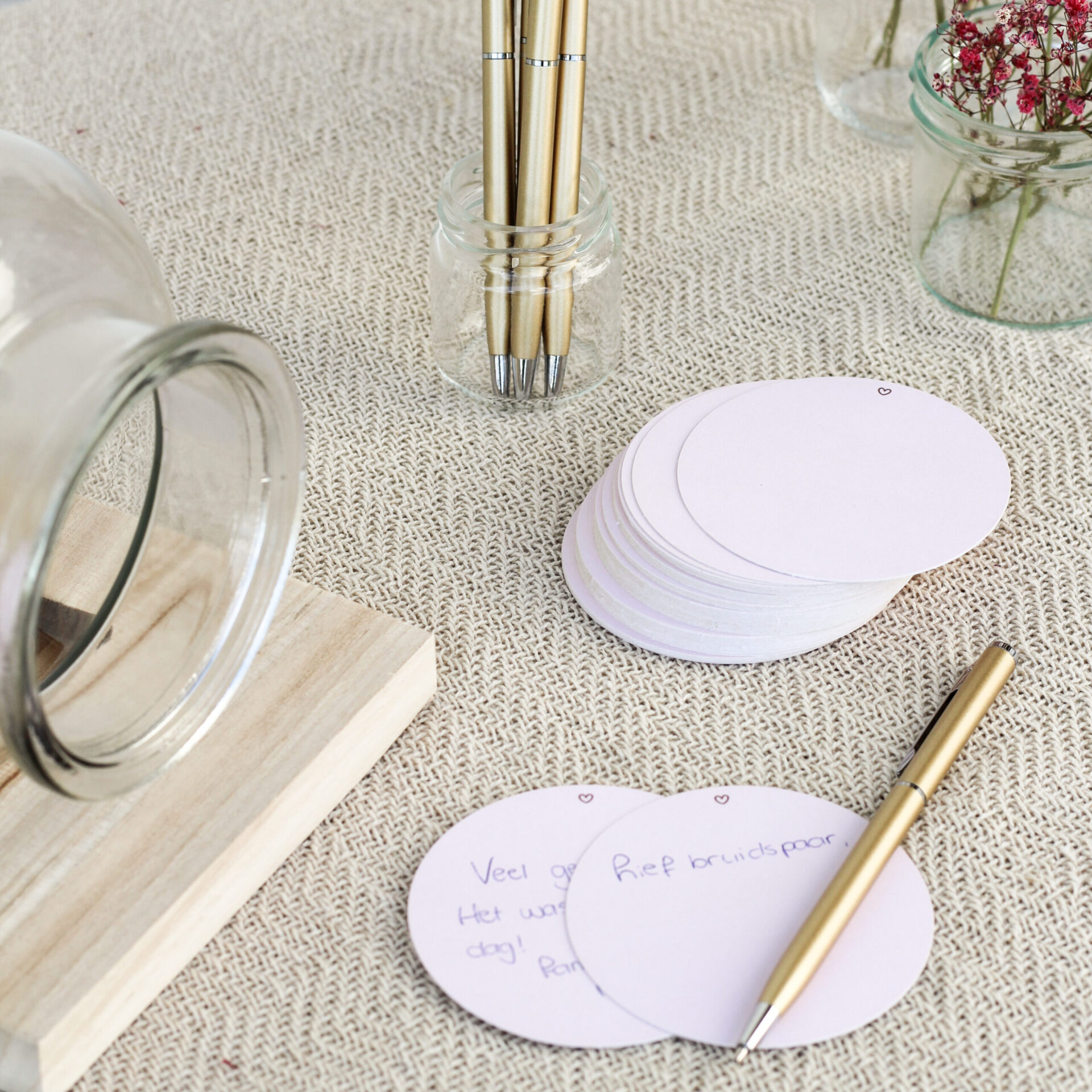 Combineer de invulkaarten met een gepersonaliseerde glazen box om alles stijlvol te bewaren. Wil je het helemaal afmaken? Bestel er pennen bij, zodat jullie gasten meteen aan de slag kunnen.