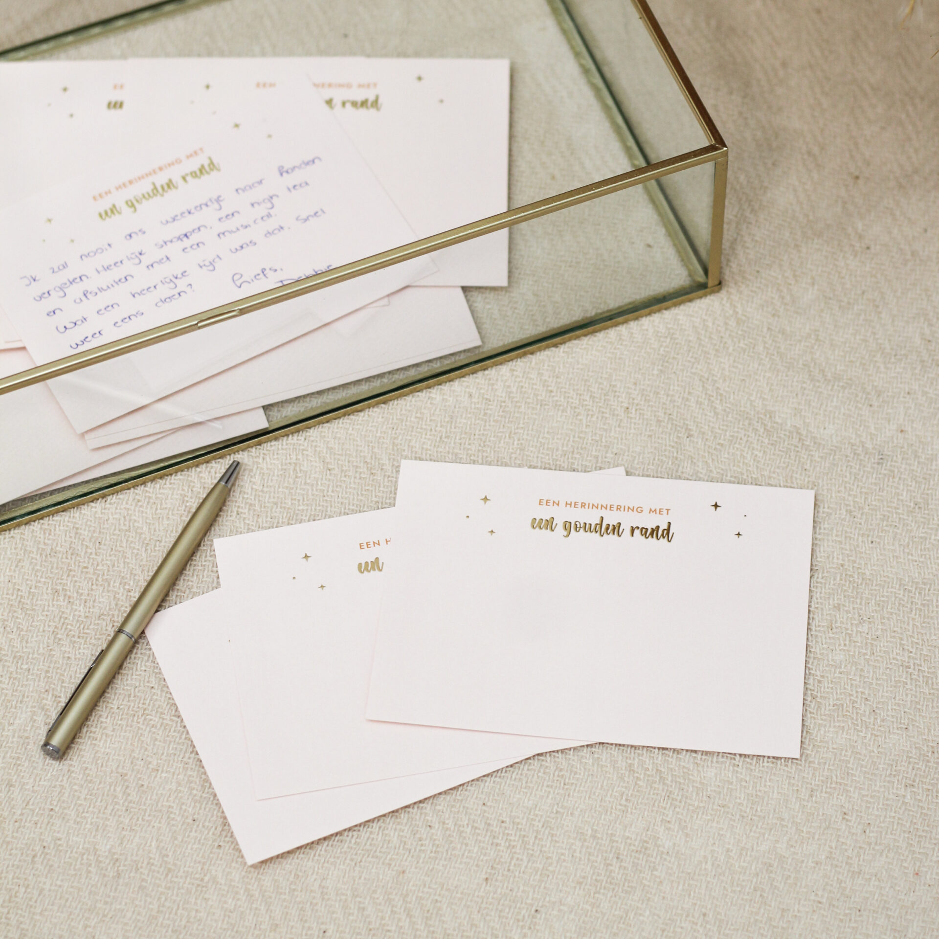 Combineer de kaarten met een stijlvolle gepersonaliseerde glazen box om ze mooi te bewaren. Voor extra gemak kun je er pennen bij leggen, zodat jullie gasten meteen hun gouden herinneringen kunnen delen.