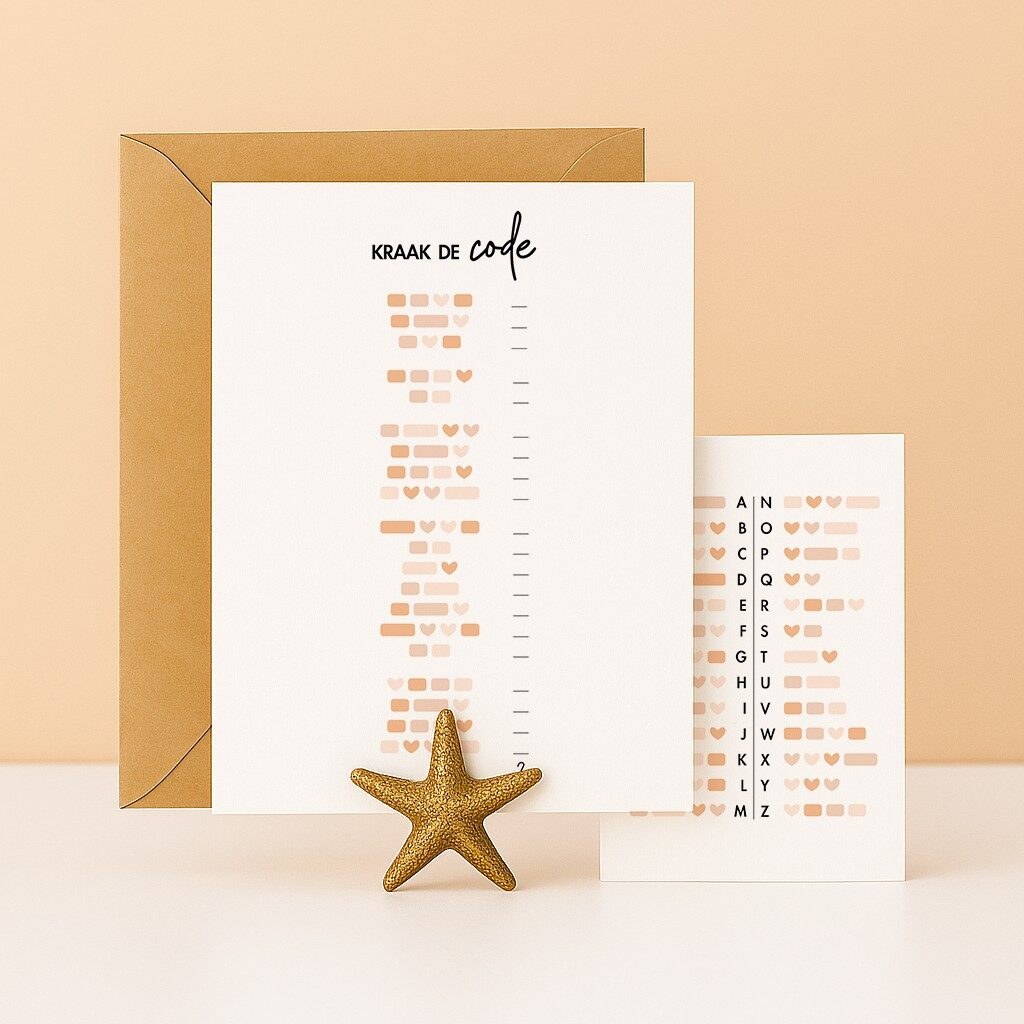Je ontvangt ook een extra kaart met het volledige morse-alfabet – zo kan jouw toekomstige getuige meteen aan de slag met het kraken van de geheime boodschap.