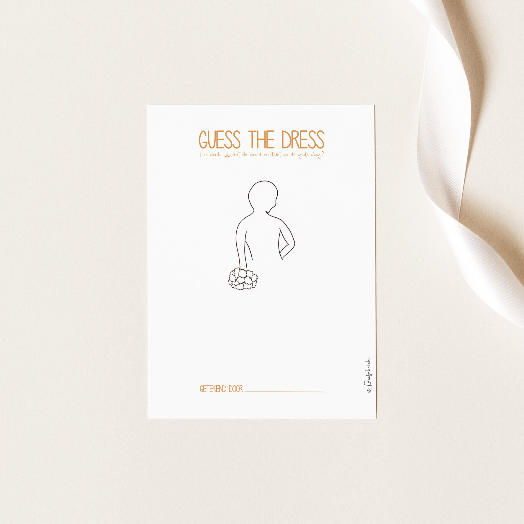 Maak de bruiloft of het vrijgezellenfeest extra leuk met deze originele activiteit: laat de gasten de trouwjurk van de bruid raden! Geef bij binnenkomst de printable aan de gasten, zodat zij hun voorspelling kunnen tekenen. Verzamel daarna alle tekeningen en geef ze aan het bruidspaar. Het is een leuke manier om te zien wie het dichtst bij de echte trouwjurk komt en biedt bovendien een uniek aandenken voor het bruidspaar.