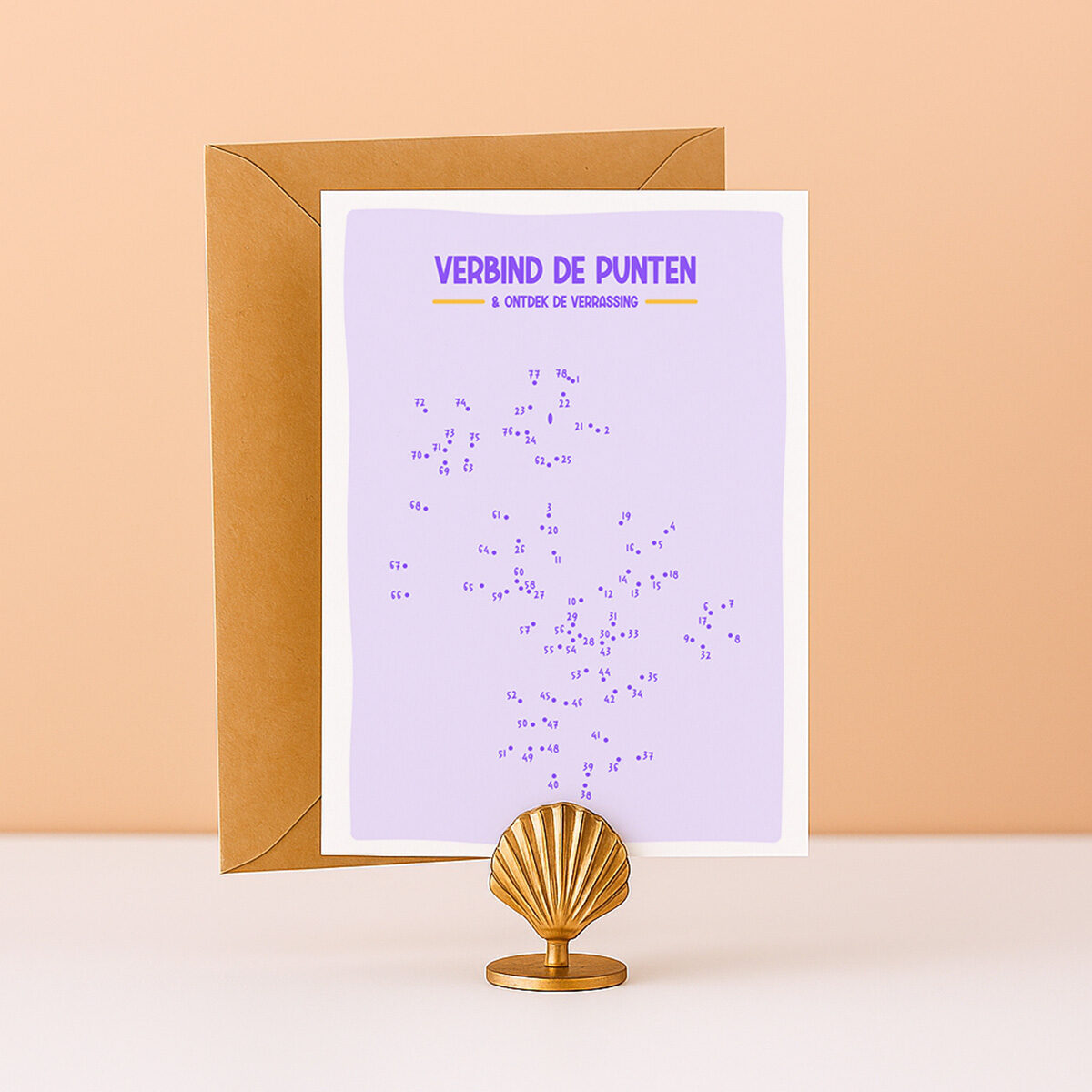 Op zoek naar een speelse én verrassende manier om te vertellen dat je zwanger bent? Deze Verbind de punten-kaart lijkt op het eerste gezicht gewoon een leuk spelletje – maar zodra de ontvanger de punten met elkaar verbindt, verschijnt langzaam het echte nieuws: een ooievaar met een doekje in zijn snavel… hét teken dat er een baby op komst is!